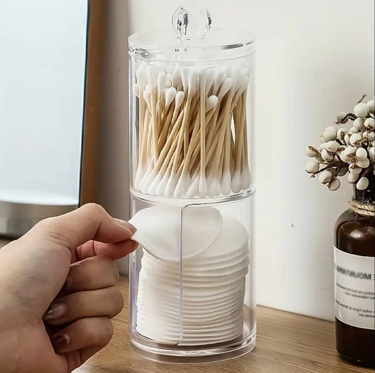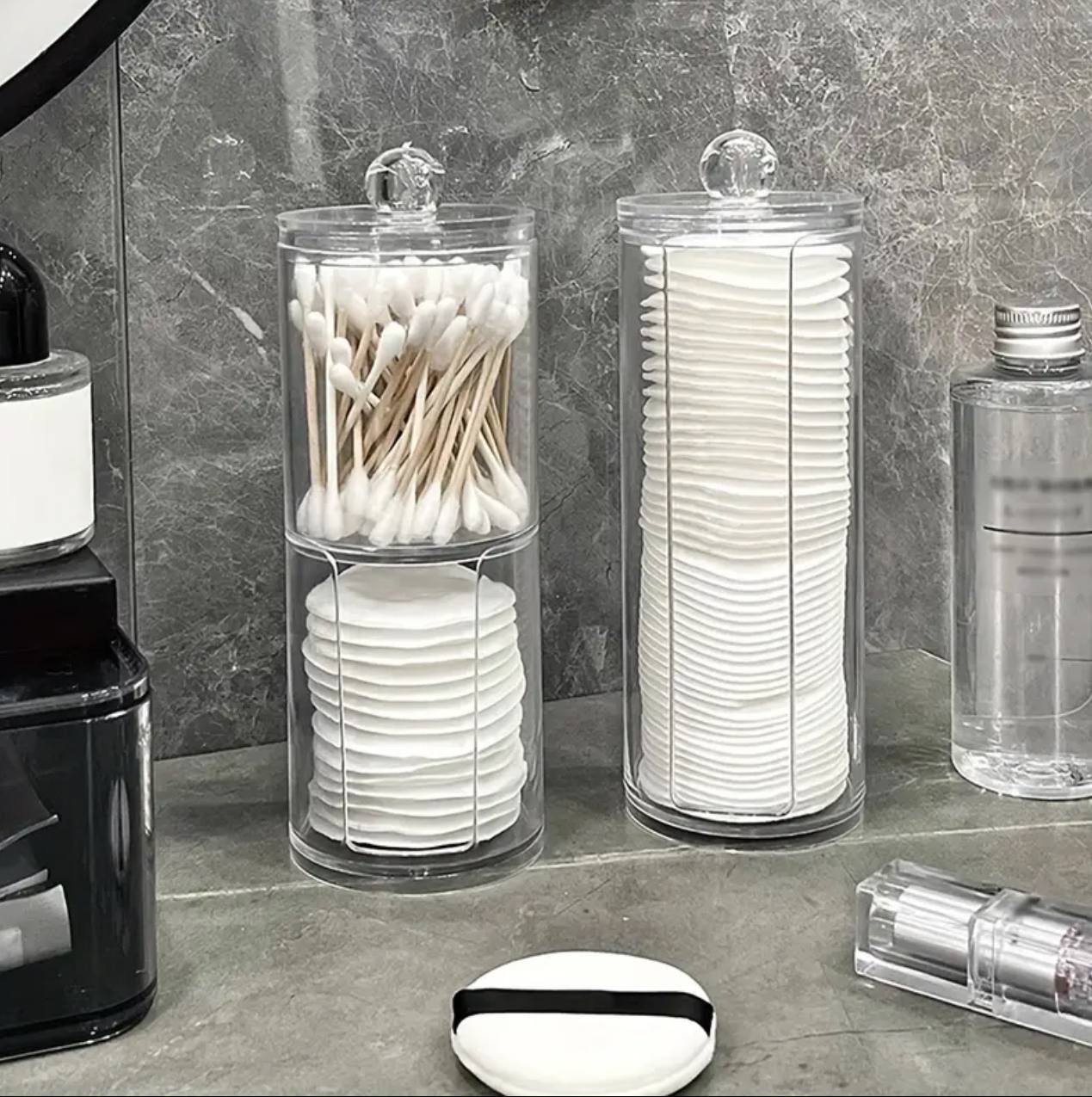 Keep your essentials organized with this 2-layer acrylic multifunctional round storage box. Perfect for Q-tips, makeup cotton pads, and small accessories, its sleek design ensures durability and style, adding convenience and elegance to your vanity or bathroom counter.