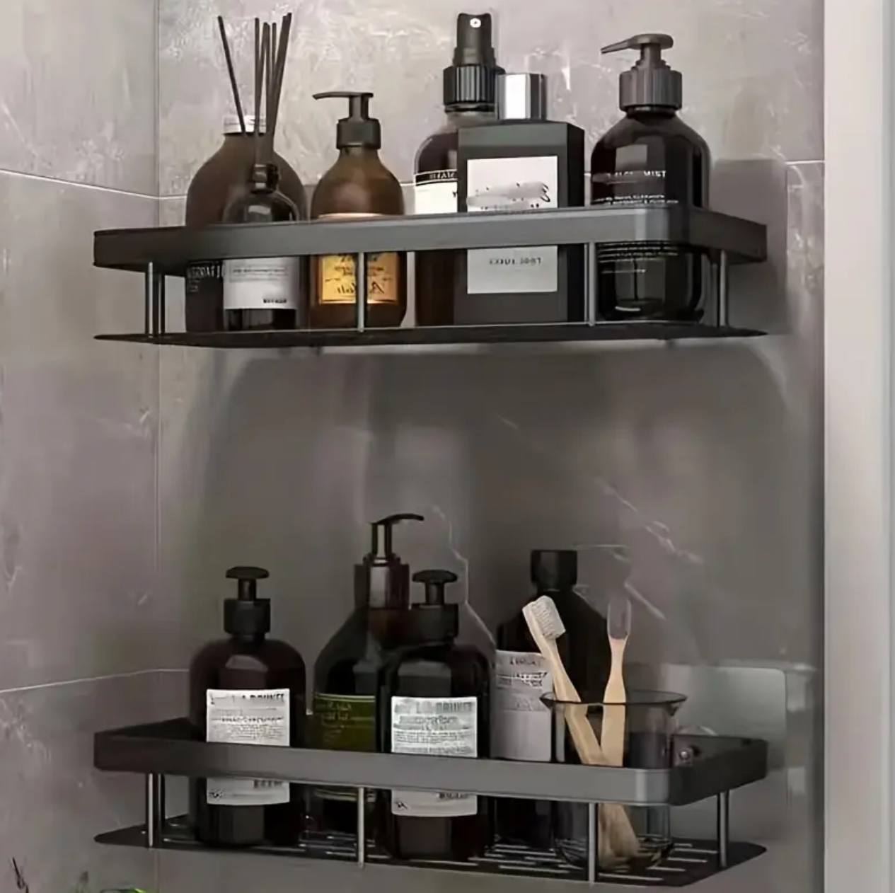 Upgrade your storage with 2 rustproof aluminum alloy shelves! Easy wall-mount installation with strong adhesive stickers—no drilling needed. Perfect for bathrooms or kitchens, these durable rectangular shelves provide sleek, space-saving organization for toiletries, spices, or essentials. Stylish and functional!