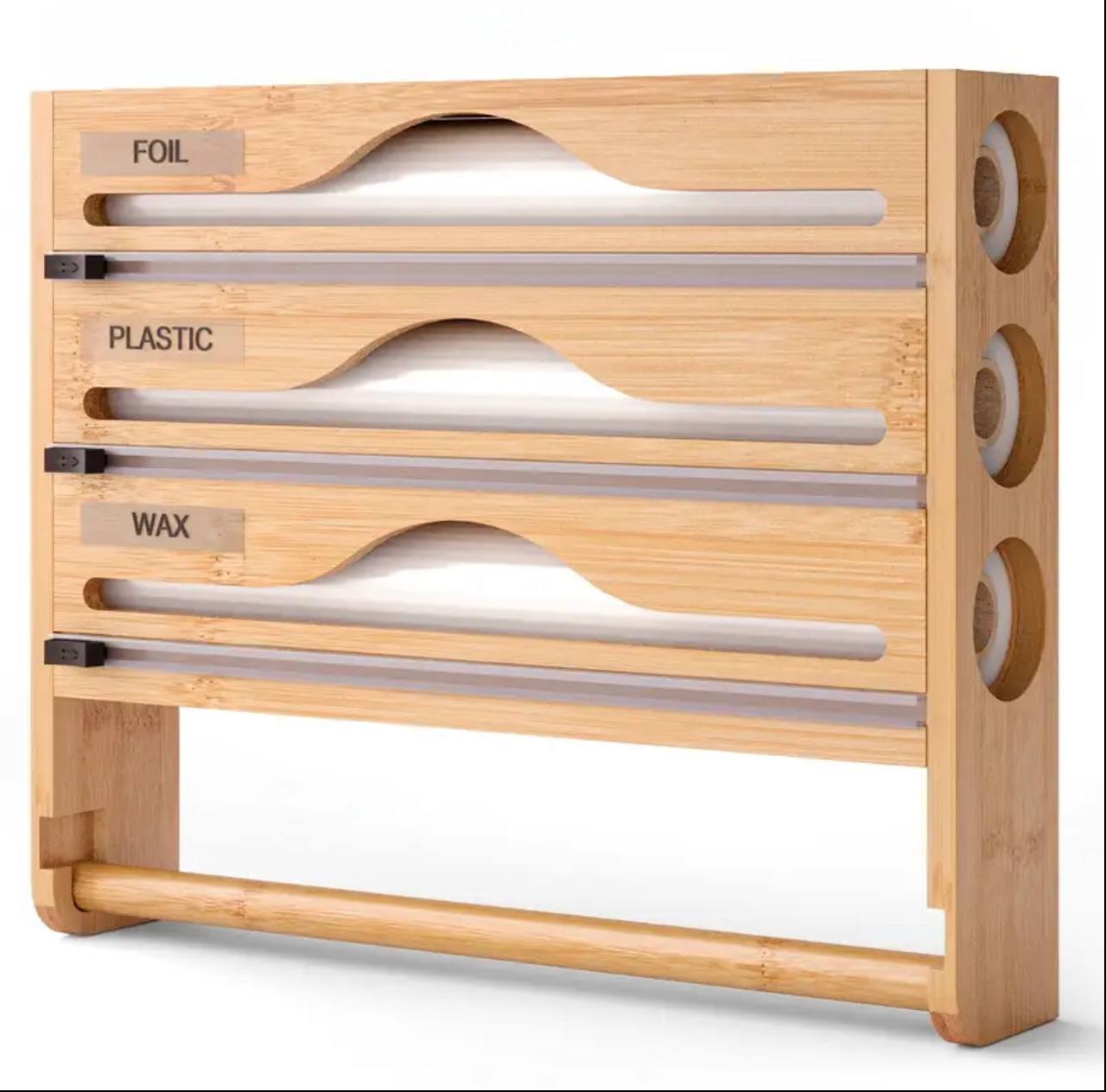 3-in-1 Roll Dispenser—organize aluminium foil, plastic wrap, and parchment in one sleek bamboo unit. Wall-mountable with sliding cutters for clean, easy use. A solid, stylish kitchen essential for clutter-free, efficient food prep.