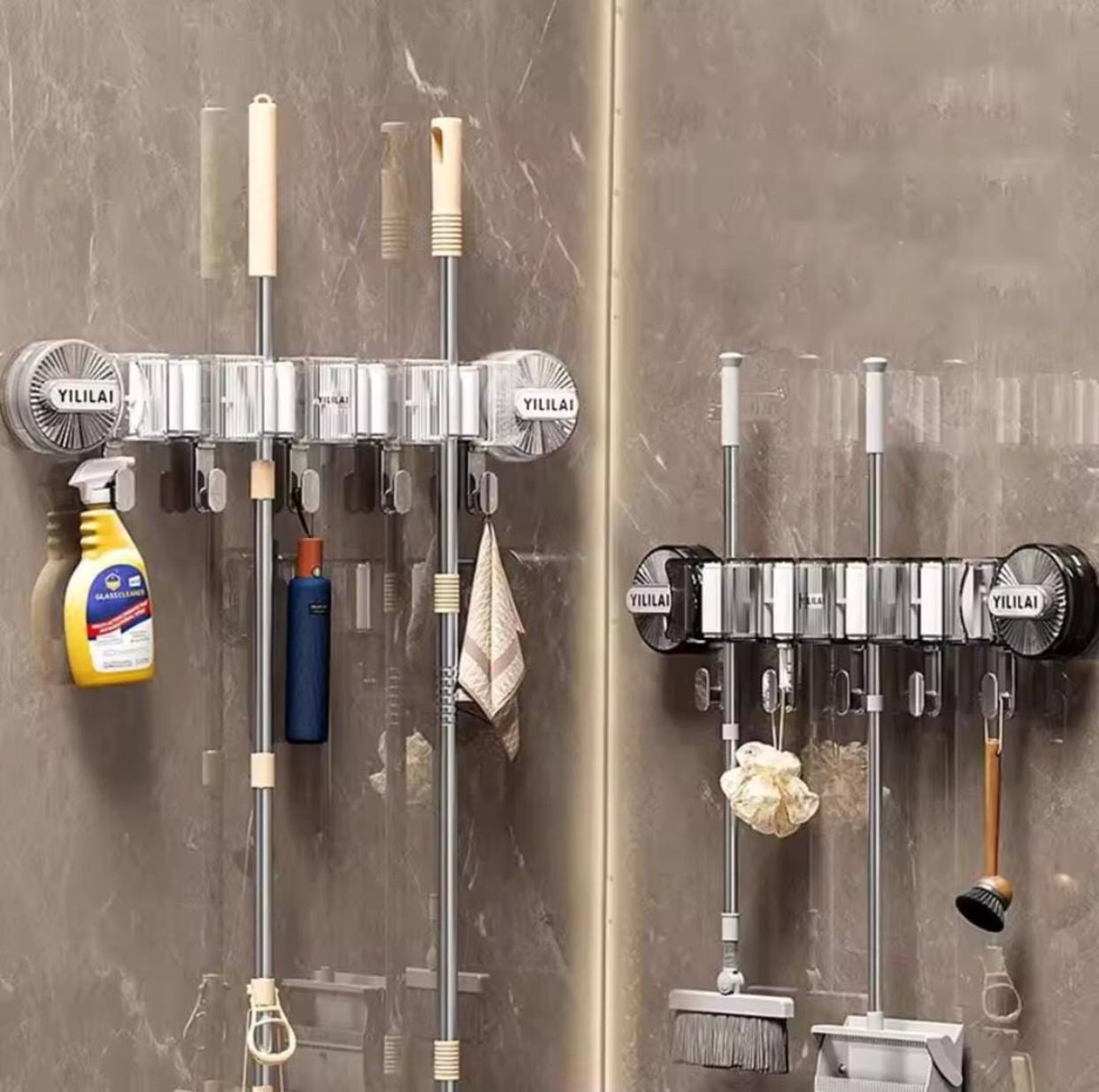 Declutter your space with this 4-hole multi-purpose mop hanger rack. Ideal for kitchens, bathrooms, or sinks, it features strong self-adhesive backing for heavy loads. No drilling needed—just stick and organize. Includes hanging hooks for extra storage convenience.