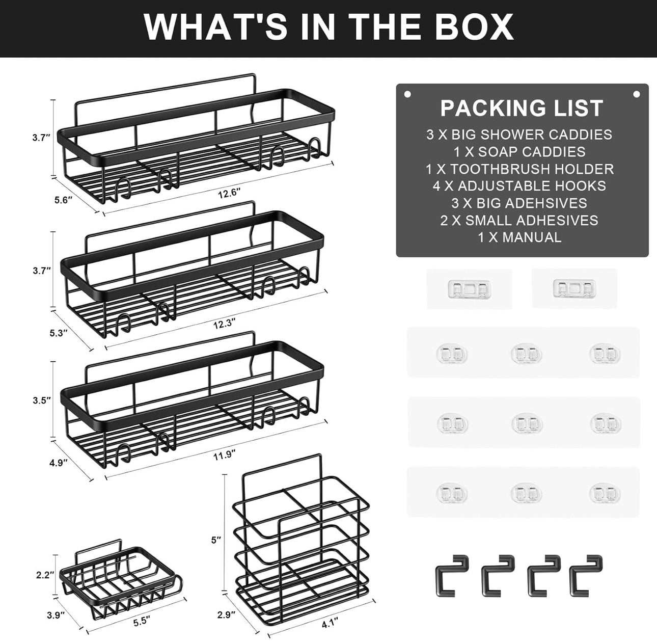 Upgrade your bathroom with this 5-piece rustproof shower caddy set! Easy no-drill installation with high-capacity adhesive. Perfect for smooth, flat walls like tiles, glass, and marble. Organize effortlessly while maintaining a sleek, modern look