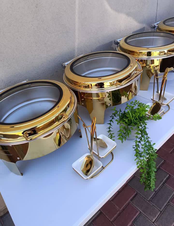 Serve in style with this 6L hydraulic auto-close chafing dish in elegant gold. Designed for effortless buffet service, it keeps food warm while preventing heat loss. The sleek, durable design adds a touch of luxury to any catering or event setup.