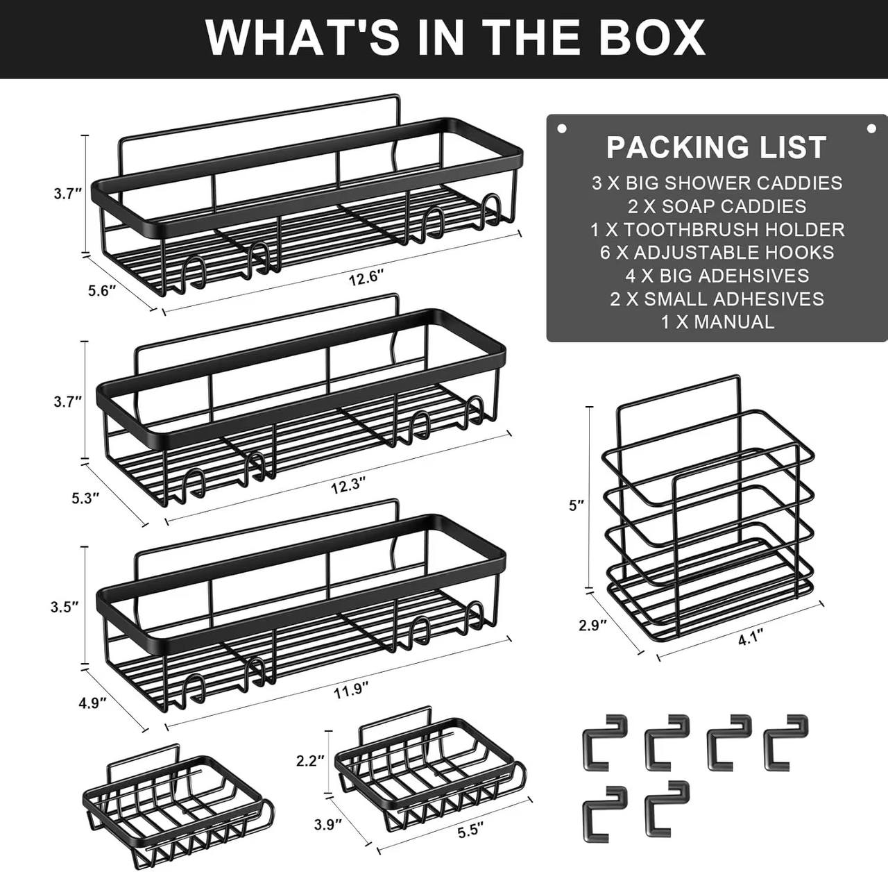 Upgrade your bathroom with our 6-Piece Shower Caddy Set! Rustproof and drill-free, it features strong adhesive for increased load capacity, perfect for smooth surfaces like tiles, marble, wood, metal, and glass. Keep your essentials organized with this space-saving solution!