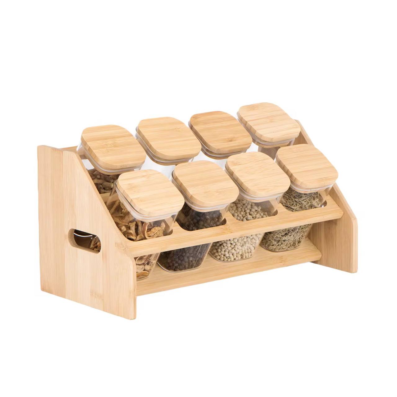 8pcs Classic Style Square Borosilicate Glass Jar Set—includes bamboo lids, a storage rack, 10 labeling stickers, and 1 pen. 300ml large-capacity jars ideal for spices or dry goods. Stylish, durable, and perfect for modern kitchens.