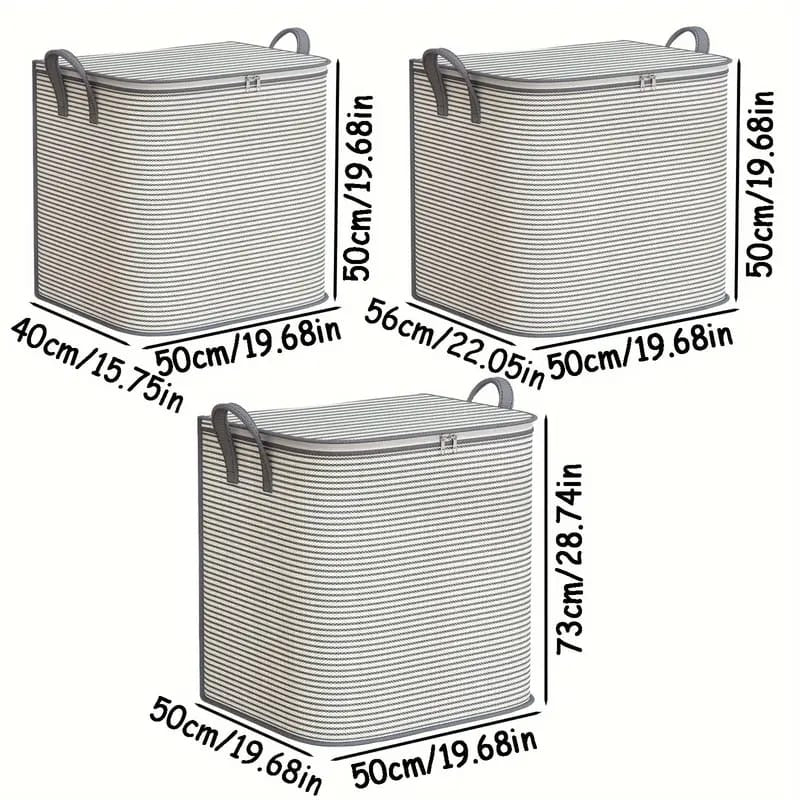 Organize your clothes effortlessly with this set of 3 striped quilt duvet/closet organizer bags. Made from waterproof, moisture-proof non-woven fabric, each bag features a zipper and ample capacity to store clothing, bedding, or luggage. Available in 110L, 140L, and 180L sizes.