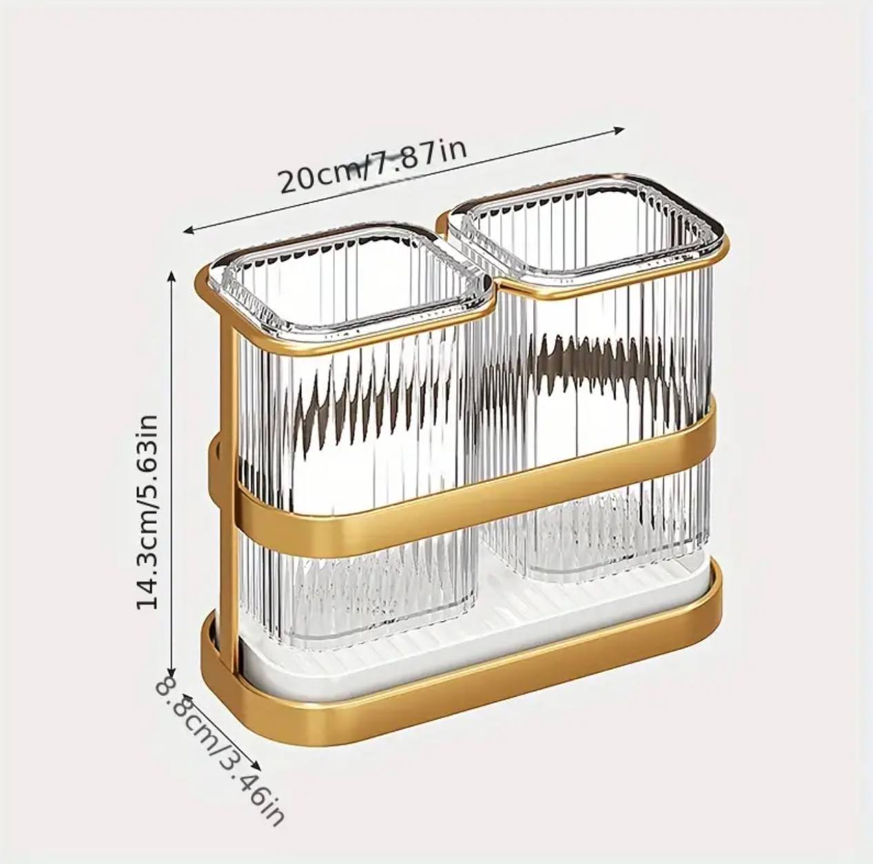 Maximize kitchen space with this wall-mounted cutlery organizer. Featuring a sleek clear acrylic holder with a gold stand, it combines functionality with elegance. Keep your utensils neatly organized and easily accessible while adding a stylish touch to your kitchen.